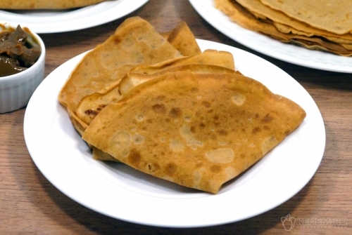 Блины с тестом на вареной сгущенке готовы. Можно подавать к чаю со сгущенным молоком, любимым вареньем или мёдом.