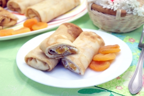 Выложить начинку на блины.