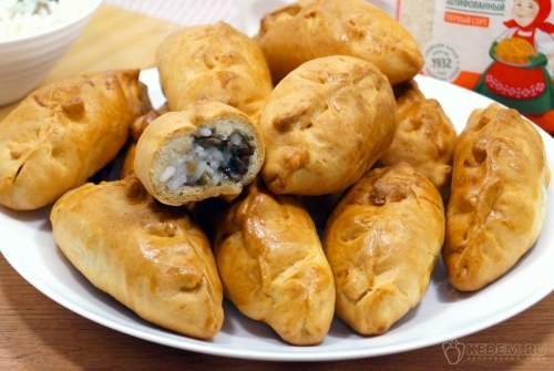 Печеные пирожки с рисом и грибами в духовке готовы. Выложить на блюдо и подавать к столу.