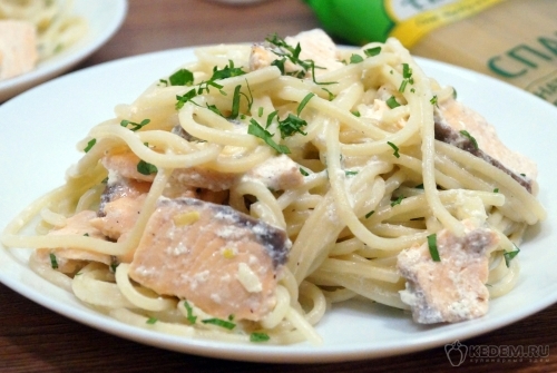 Добавить спагетти в сковороду к семге в сливочном соусе и перемешать. Подержать на огне 1-2 минуты.