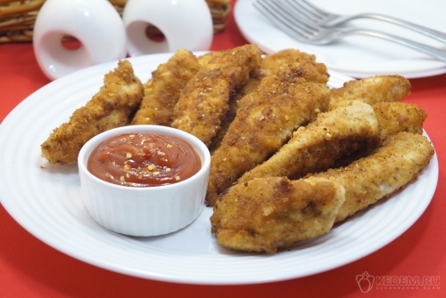 Кусочки куриного филе выложить на блюдо и подавать с томатным или любимым соусом.