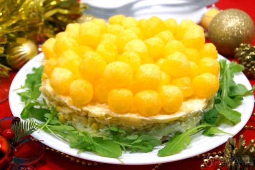 Новогодний салат с кукурузными шариками «Бабл» готов. Можно подавать к праздничному столу.