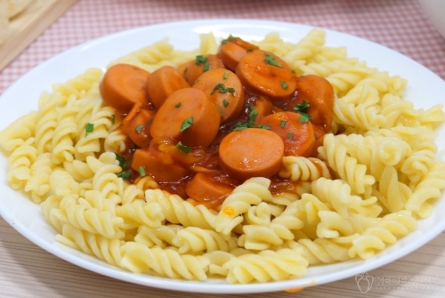 Нарезать 200 грамм сосисок кружочками.