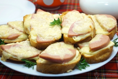 Горячие бутерброды в духовке с вареной колбасой готовы. Выложить на блюдо и подавать к столу.