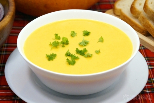 Суп-пюре из тыквы с плавленым сыром готов. Можно подавать к столу.