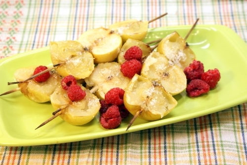 Запеченные яблоки с сахаром и малиной готовы. Выложить яблочные шашлычки на блюдо и украсить ягодами малины.