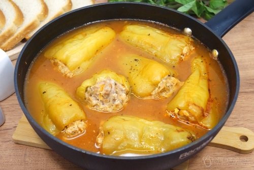 Перцы очистить от сердцевины и нафаршировать мясным фаршем.