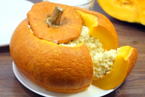 Пшенная каша на молоке в тыкве готова. Переложить на блюдо и подавать к столу.