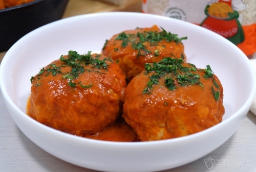 Куриные тефтели с рисом в томатном соусе готовы. Можно подавать к столу.