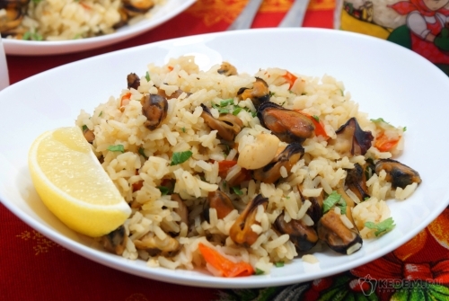 Паэлья с морепродуктами готова. Разложить по тарелкам и подавать к столу с ломтиком лимона.