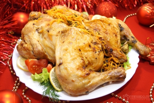 Запеченная курица с грибами готова. Подавать к новогоднему столу.