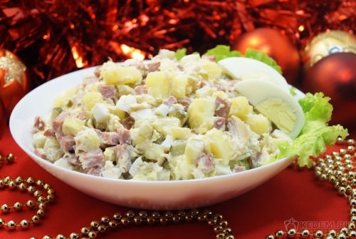 Салат «Неоливье» с курицей готов. Можно подавать к праздничному столу.