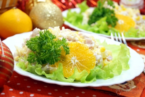 Выложить салат на блюдо и украсить веточкой петрушки и ломтиком мандаринки.