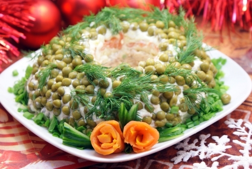 Овощи и яйца отварить до готовности и почистить. Салат выкладывать слоям, можно с серединкой, можно без нее. Первым слоем выложить тертый картофель. Смазать майонезном.