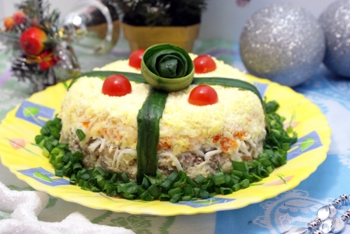 Салат «Подарочек», новогодние салаты, рецепты на Новый год, праздничные рецепты, слоёные салаты, рецепт, рецепт салата, рецепты новогодних салатов, рецепт приготовления салата, приготовление слоеного салата, приготовление салата с консервированной рыбой, пошаговый кулинарный рецепт с фотографиями приготовление слоеного салата на Новый год Салаты с рыбой и морепродуктами европейская, русская