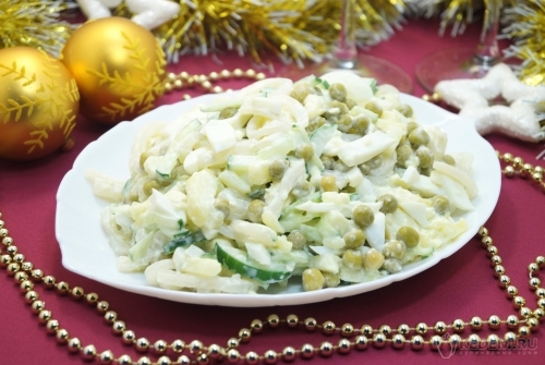 Салат с кальмарами и свежим огурцом «Романс» готов. Можно подавать к новогоднему столу.
