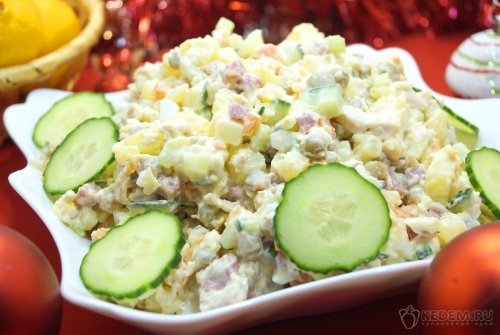 Хорошо перемешать и посолить по вкусу. Салат «Новогодний Оливье» готов. Выложить в салатницу и подавать к новогоднему столу.